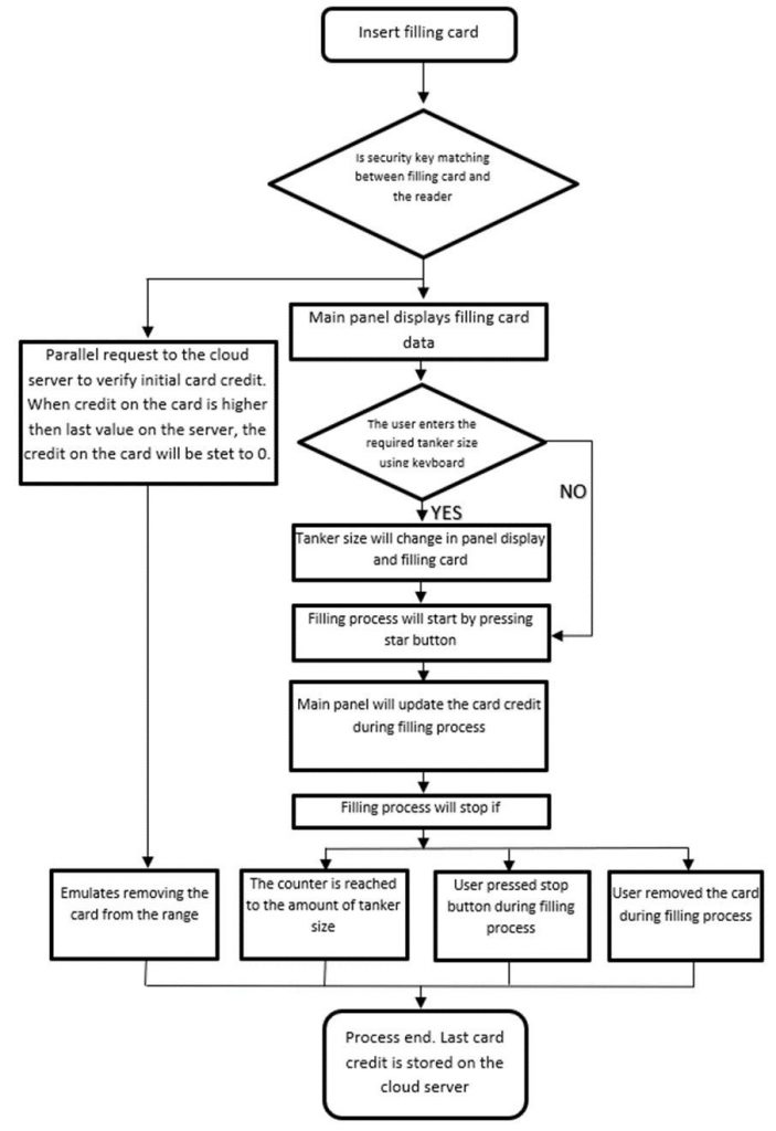 Once the user inserts a card into the water filling station slot provided, the reader reads the amount of credit stored on the card. Then, the GSM module connects to the cloud database and looks for the given card UID in the database. It will then compare the number of credits stored in the card and the number of credits saved in the database. If both numbers are the same the reader will accept the card and allow the user to fill their container. After the filling procedure the reader will decrease the number of credits on the card as well as in the database.
